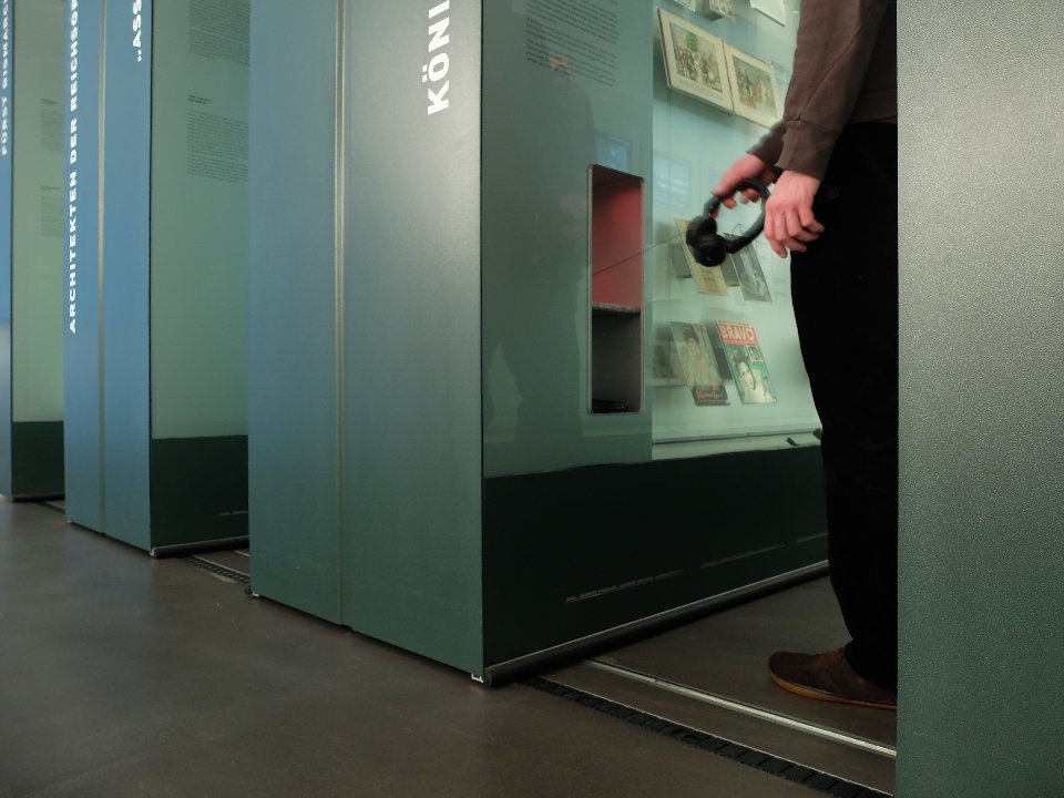 "Krieg & Gedächtnis" sind drei Rollregalanlagen im Themenparcours des Militär- Je nachdem welche Gänge sich öffnen, aktivieren sich automatisch Ton- und Filmstationen, genau wie die Signal- und Vitrinenbeleuchtung. Die Kopfseiten jedes Blocks werden mit Projektionen bespielt. 2011 bis 2014 haben wir die Schnittstellen